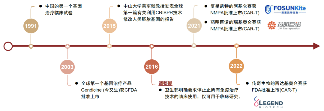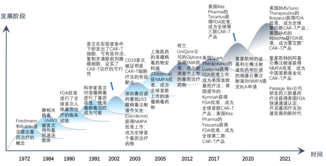 我國(guó)細(xì)胞與基因治療在20世紀(jì)90年代已有臨床研究,至2005年有兩款針對(duì)實(shí)體瘤的CGT產(chǎn)品,但是之后幾年熱度消散,直到2010年后細(xì)胞治療開始受到各大藥企及研發(fā)機(jī)構(gòu)的青睞。2016年,魏則西事件一度導(dǎo)致一些細(xì)胞免疫管線研發(fā)進(jìn)展滯后,然而隨著相關(guān)技術(shù)指導(dǎo)與監(jiān)管體系的完善,CGT發(fā)展迅速,大量CGT產(chǎn)品進(jìn)入臨床試驗(yàn),生物技術(shù)公司爭(zhēng)相布局CGT產(chǎn)業(yè),復(fù)星凱特的阿基侖賽注射液于2021年6月獲得NMPA批準(zhǔn),成為中國(guó)首款上市的CAR-T產(chǎn)品。2022年傳奇生物的CAR-T產(chǎn)品西達(dá)基奧侖賽獲FDA批準(zhǔn)上市。