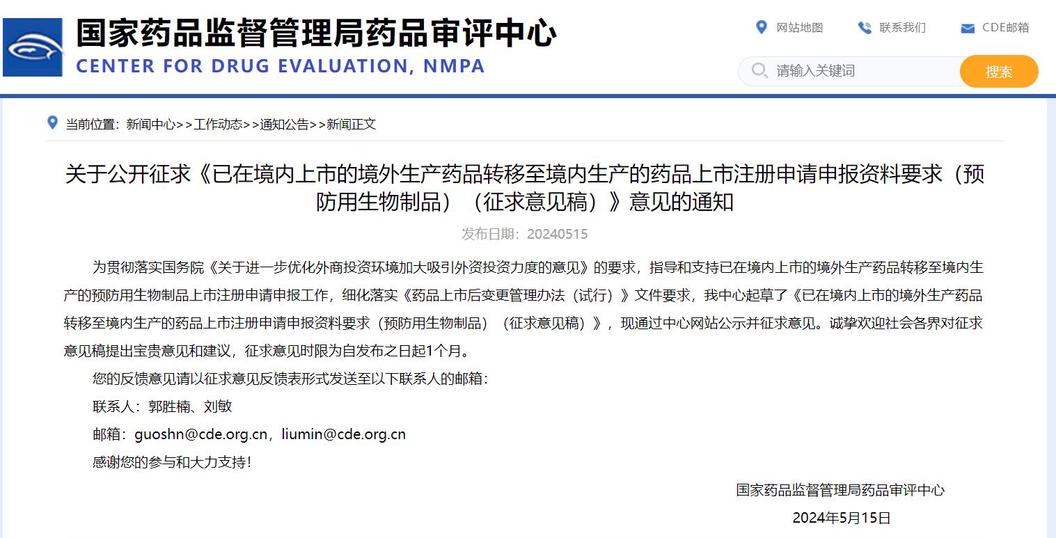 關(guān)于公開(kāi)征求《已在境內(nèi)上市的境外生產(chǎn)藥品轉(zhuǎn)移至境內(nèi)生產(chǎn)的藥品上市注冊(cè)申請(qǐng)申報(bào)資料要求(預(yù)防用生物制品)(征求意見(jiàn)稿)》意見(jiàn)的通知
