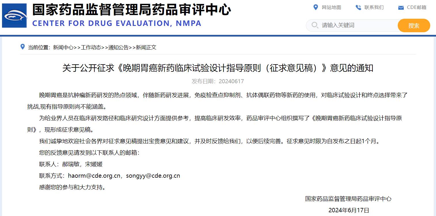 關(guān)于公開征求《晚期胃癌新藥臨床試驗(yàn)設(shè)計(jì)指導(dǎo)原則(征求意見稿)》意見的通知