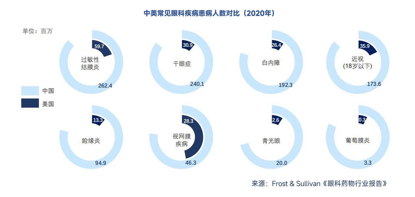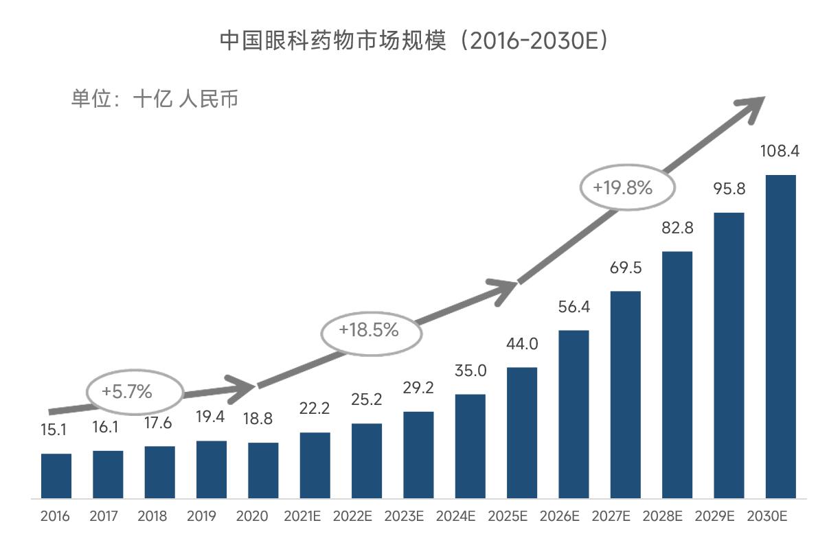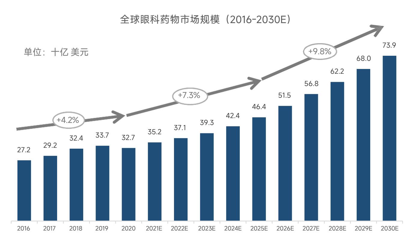 目前,全球眼科市場(chǎng)整體呈現(xiàn)出穩(wěn)定增長(zhǎng)、集中度較高的特點(diǎn)。2016年至2020 年,全球眼科藥物市場(chǎng)規(guī)模從277億美元增長(zhǎng)至327億美元,復(fù)合年增長(zhǎng)率為 4.2%。隨著未來(lái)更多眼科創(chuàng)新藥物的研發(fā)和上市,預(yù)計(jì)2025年將達(dá)到464億美元,2030年將達(dá)到739億美元。2016-2020年中國(guó)眼科藥物市場(chǎng)規(guī)模從151億增長(zhǎng)至188億元,復(fù)合年增長(zhǎng)率達(dá)5.7%,預(yù)計(jì)2025年將達(dá)到440億元,2030年將達(dá)到1084億元。預(yù)計(jì)未來(lái),中國(guó)將以超過(guò)全球2倍的平均增長(zhǎng)率快速增長(zhǎng),發(fā)展勢(shì)頭強(qiáng)勁。