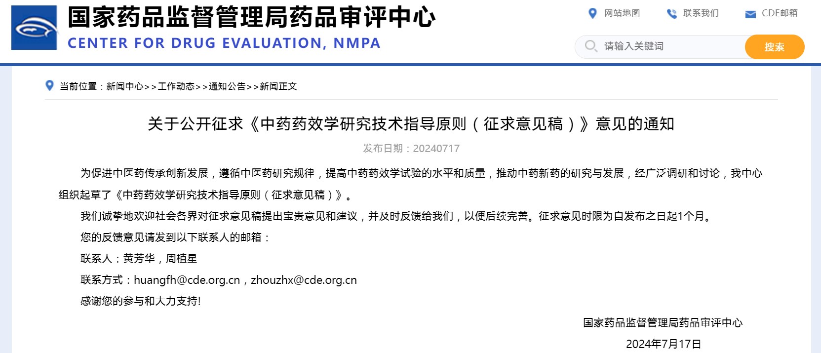 關(guān)于公開征求《中藥藥效學(xué)研究技術(shù)指導(dǎo)原則(征求意見(jiàn)稿)》意見(jiàn)的通知