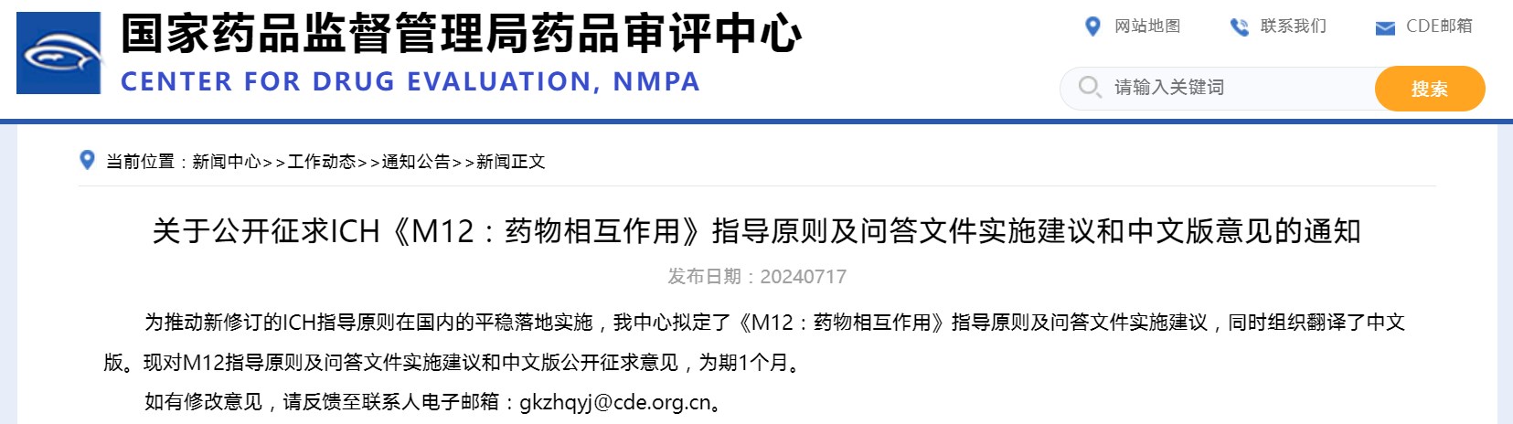 關(guān)于公開征求ICH《M12:藥物相互作用》指導(dǎo)原則及問(wèn)答文件實(shí)施建議和中文版意見(jiàn)的通知