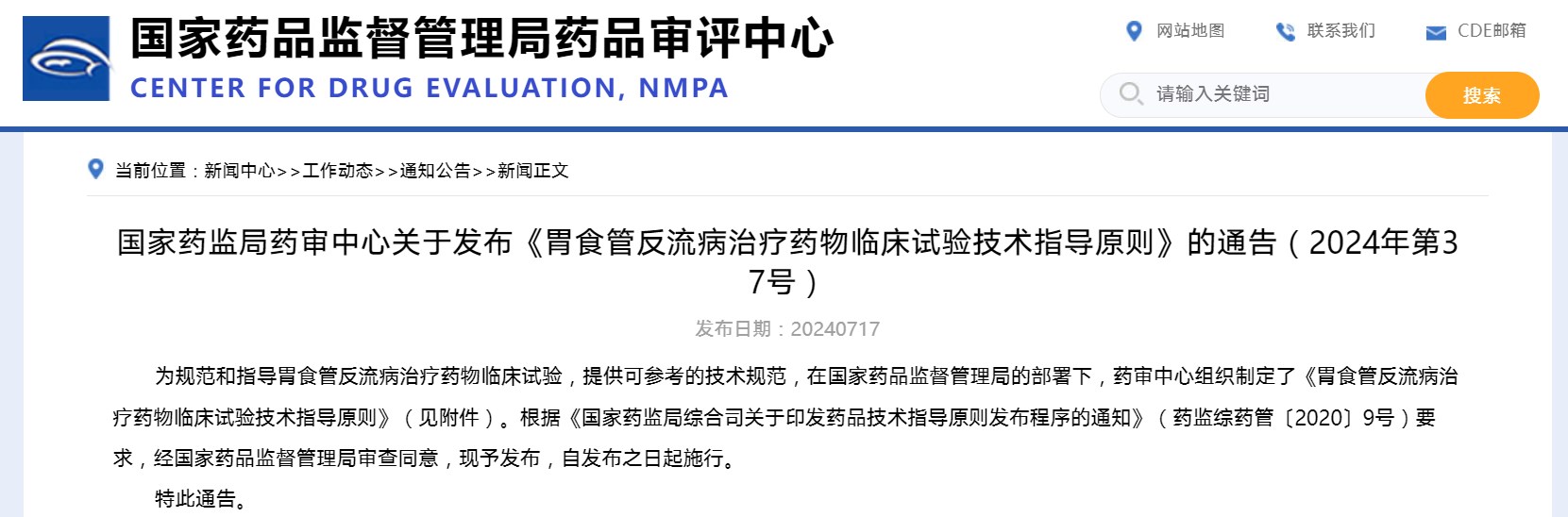 國(guó)家藥監(jiān)局藥審中心關(guān)于發(fā)布《胃食管反流病治療藥物臨床試驗(yàn)技術(shù)指導(dǎo)原則》的通告(2024年第37號(hào))