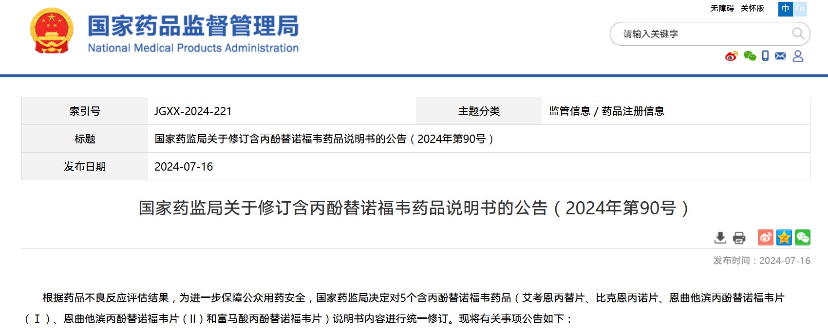 國(guó)家藥監(jiān)局關(guān)于修訂含丙酚替諾福韋藥品說(shuō)明書的公告(2024年第90號(hào))