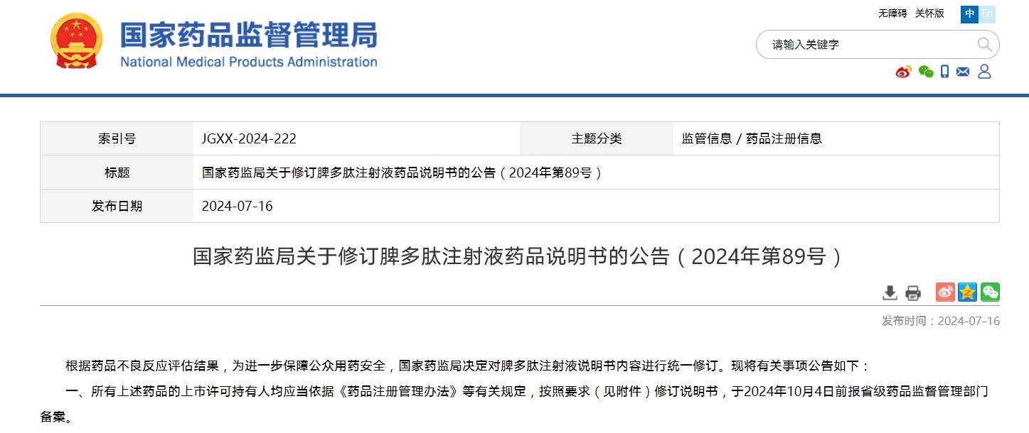 國(guó)家藥監(jiān)局關(guān)于修訂脾多肽注射液藥品說(shuō)明書的公告(2024年第89號(hào))