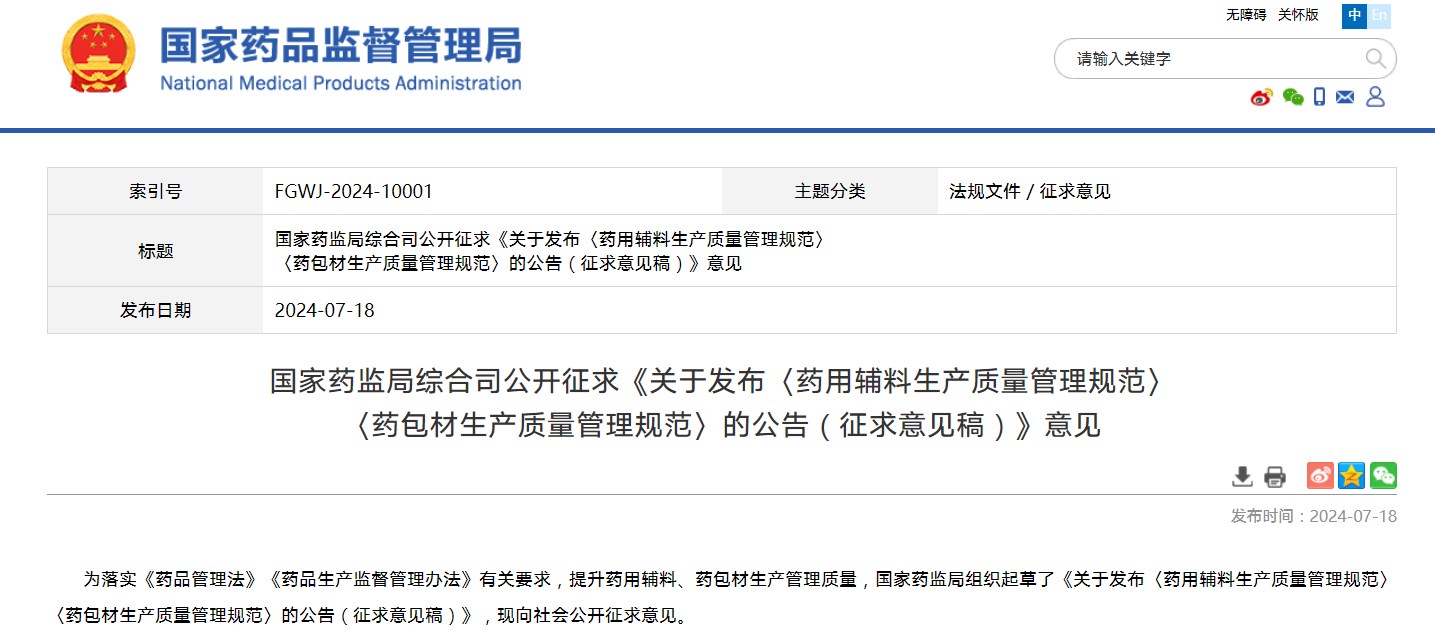 國(guó)家藥監(jiān)局綜合司公開征求《關(guān)于發(fā)布〈藥用輔料生產(chǎn)質(zhì)量管理規(guī)范〉〈藥包材生產(chǎn)質(zhì)量管理規(guī)范〉的公告(征求意見(jiàn)稿)》意見(jiàn)