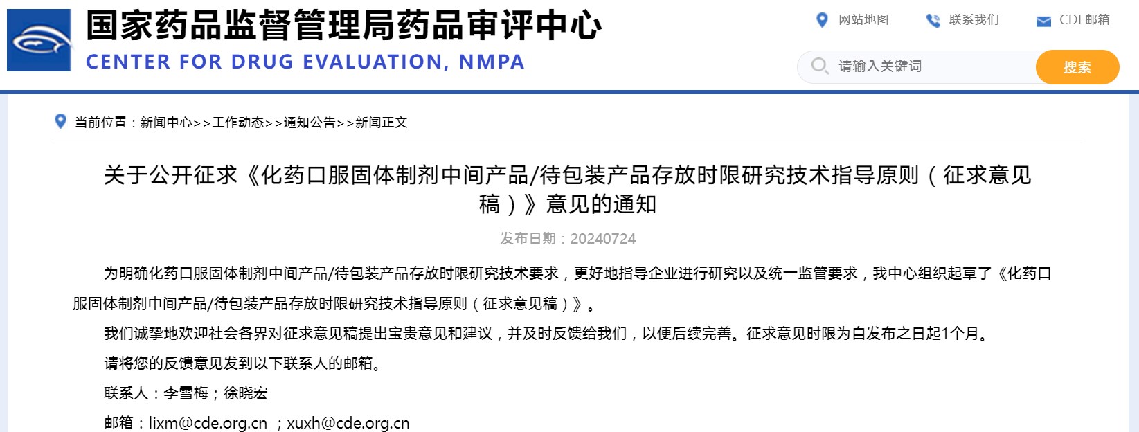關(guān)于公開征求《化藥口服固體制劑中間產(chǎn)品/待包裝產(chǎn)品存放時限研究技術(shù)指導原則(征求意見稿)》意見的通知