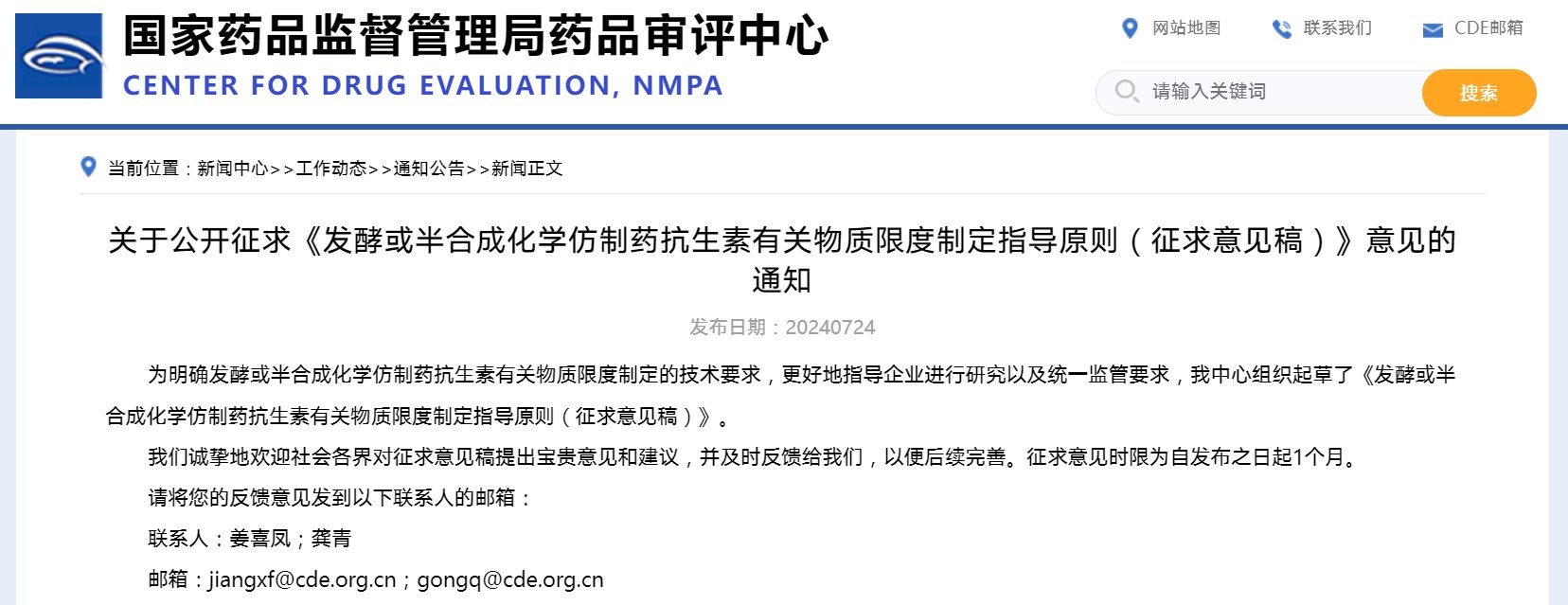 關(guān)于公開征求《發(fā)酵或半合成化學仿制藥抗生素有關(guān)物質(zhì)限度制定指導原則(征求意見稿)》意見的通知