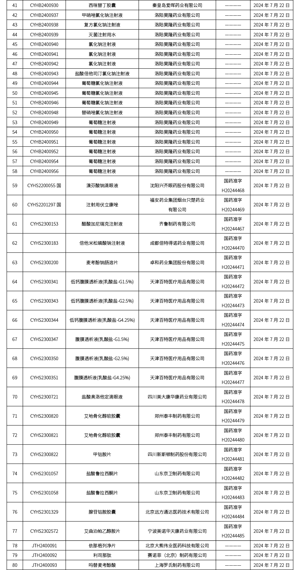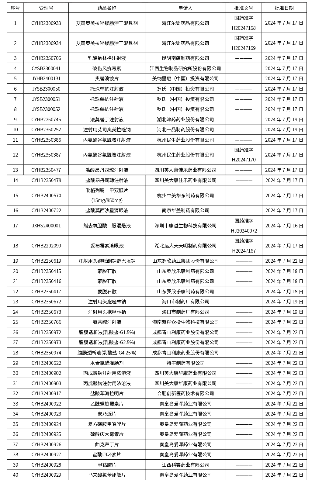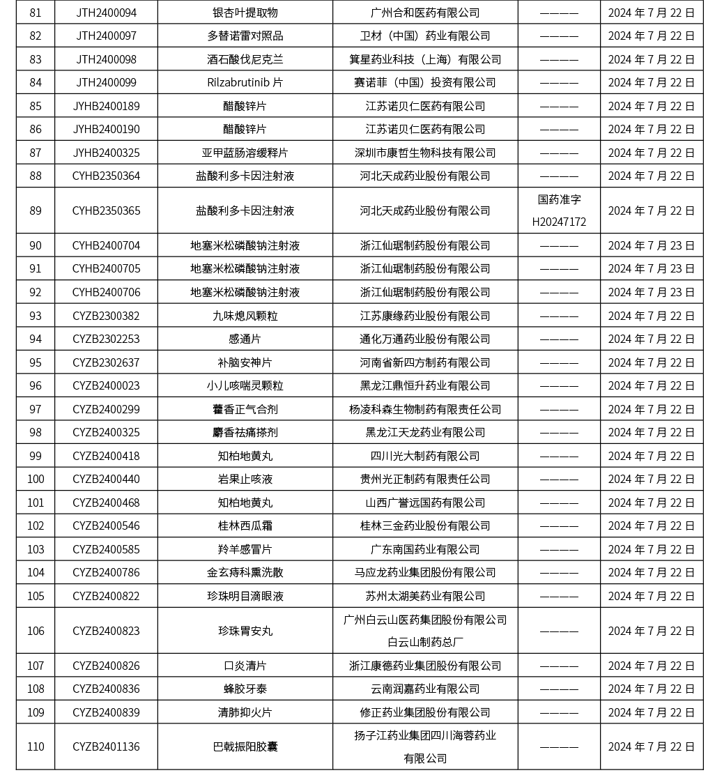 截至2024年7月26日 15:00, 發(fā)布110個待領(lǐng)取藥品批準證明文件,其中注射液41個,一致性評價品種19個。