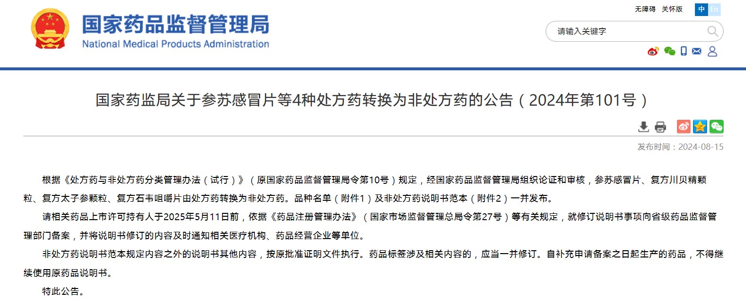 國家藥監(jiān)局關(guān)于參蘇感冒片等4種處方藥轉(zhuǎn)換為非處方藥的公告(2024年第101號)
