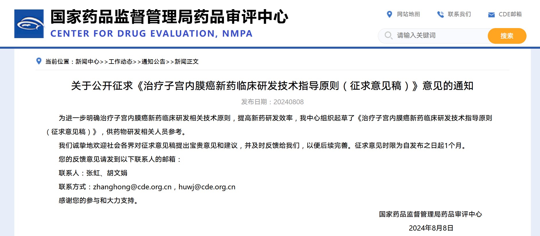 關(guān)于公開征求《治療子宮內(nèi)膜癌新藥臨床研發(fā)技術(shù)指導(dǎo)原則(征求意見稿)》意見的通知
