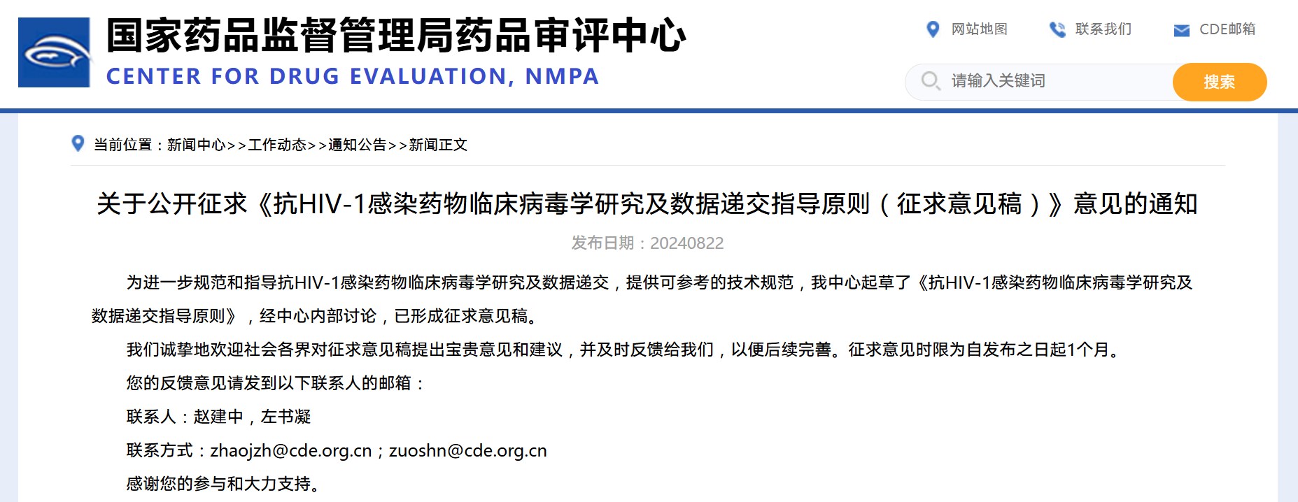 關(guān)于公開征求《抗HIV-1感染藥物臨床病毒學研究及數(shù)據(jù)遞交指導原則(征求意見稿)》意見的通知