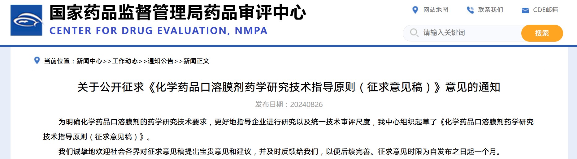 國家藥監(jiān)局藥審中心關(guān)于公開征求《化學藥品口溶膜劑藥學研究技術(shù)指導原則(征求意見稿)》意見的通知
