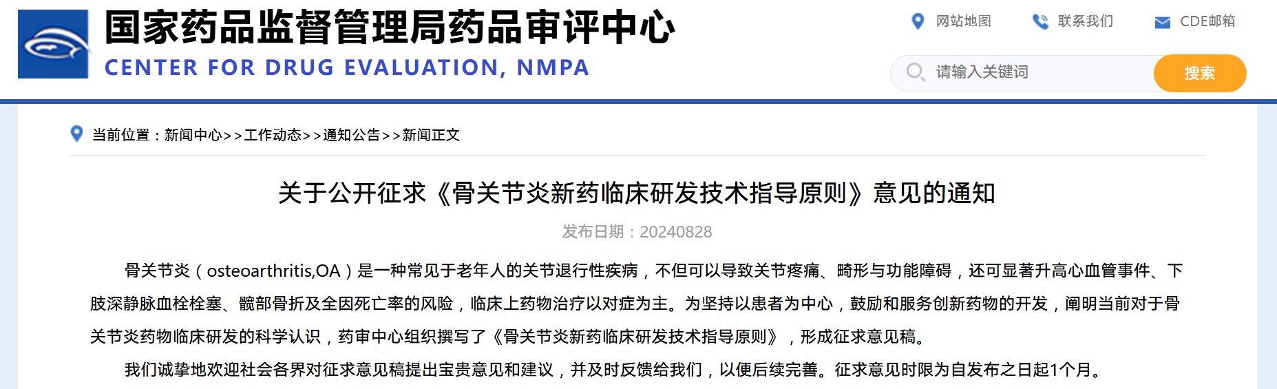 國家藥監(jiān)局藥審中心關(guān)于公開征求《骨關(guān)節(jié)炎新藥臨床研發(fā)技術(shù)指導原則》意見的通知