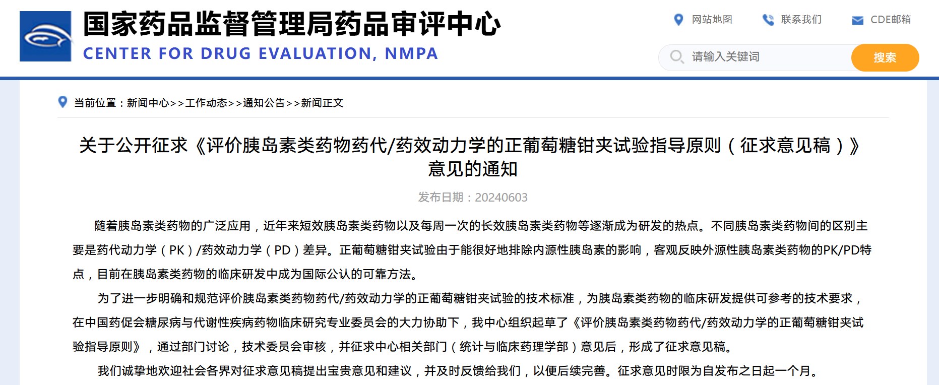 關(guān)于公開征求《評價胰島素類藥物藥代/藥效動力學的正葡萄糖鉗夾試驗指導原則(征求意見稿)》意見的通知