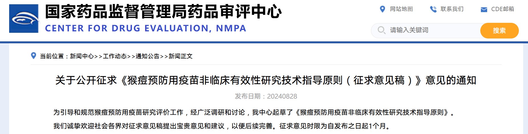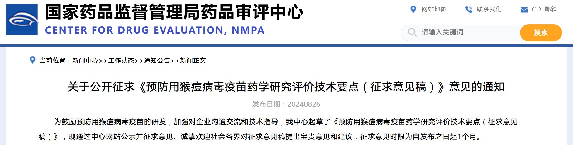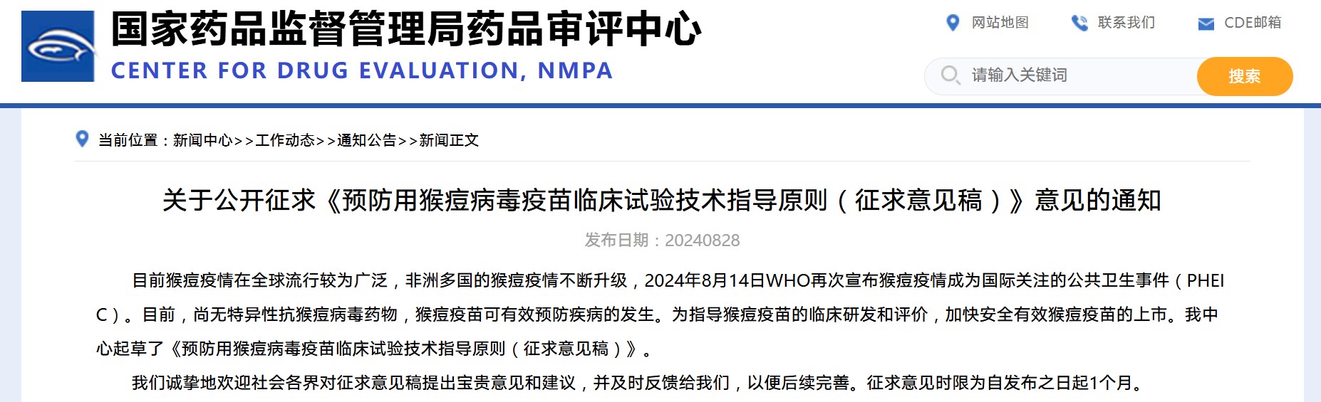 關(guān)于公開征求《預防用猴痘病毒疫苗藥學研究評價技術(shù)要點(征求意見稿)》意見的通知