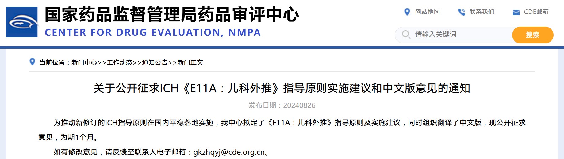 關(guān)于公開征求ICH《E11A:兒科外推》指導原則實施建議和中文版意見的通知