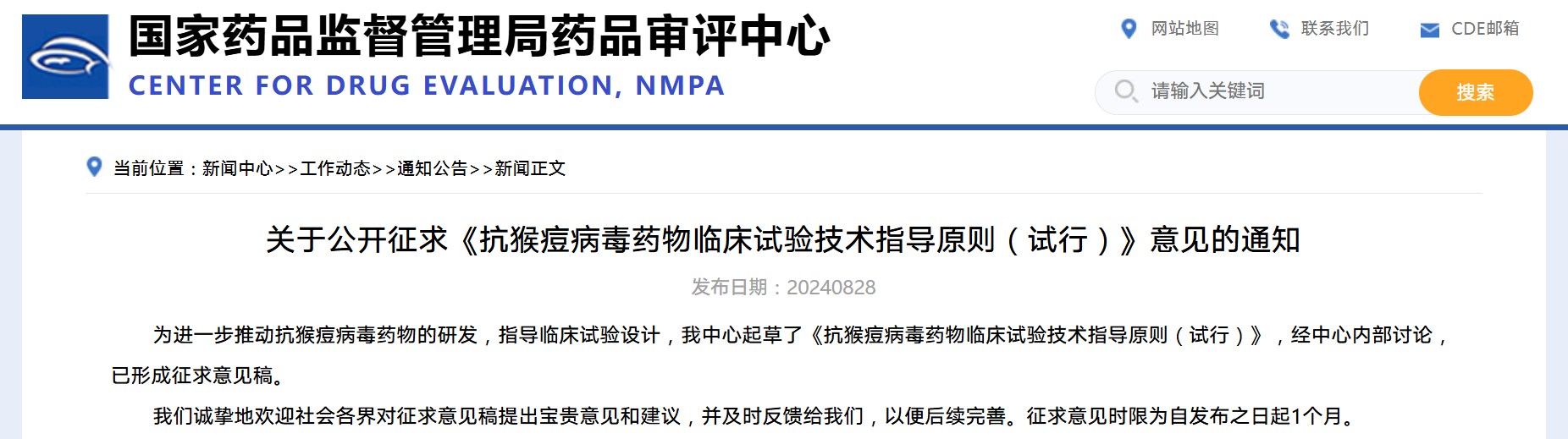 關(guān)于公開征求《抗猴痘病毒藥物臨床試驗技術(shù)指導原則(試行)》意見的通知