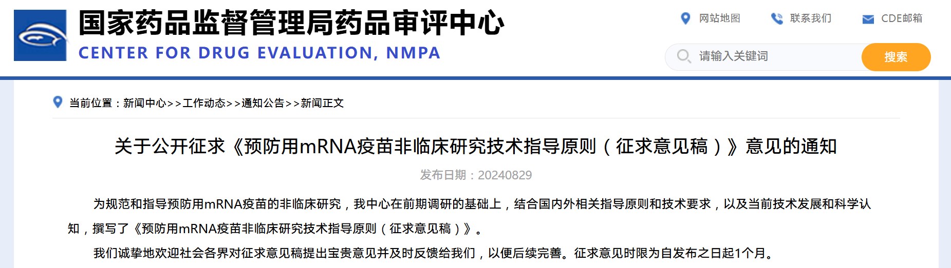 關(guān)于公開征求《預防用mRNA疫苗非臨床研究技術(shù)指導原則(征求意見稿)》意見的通知