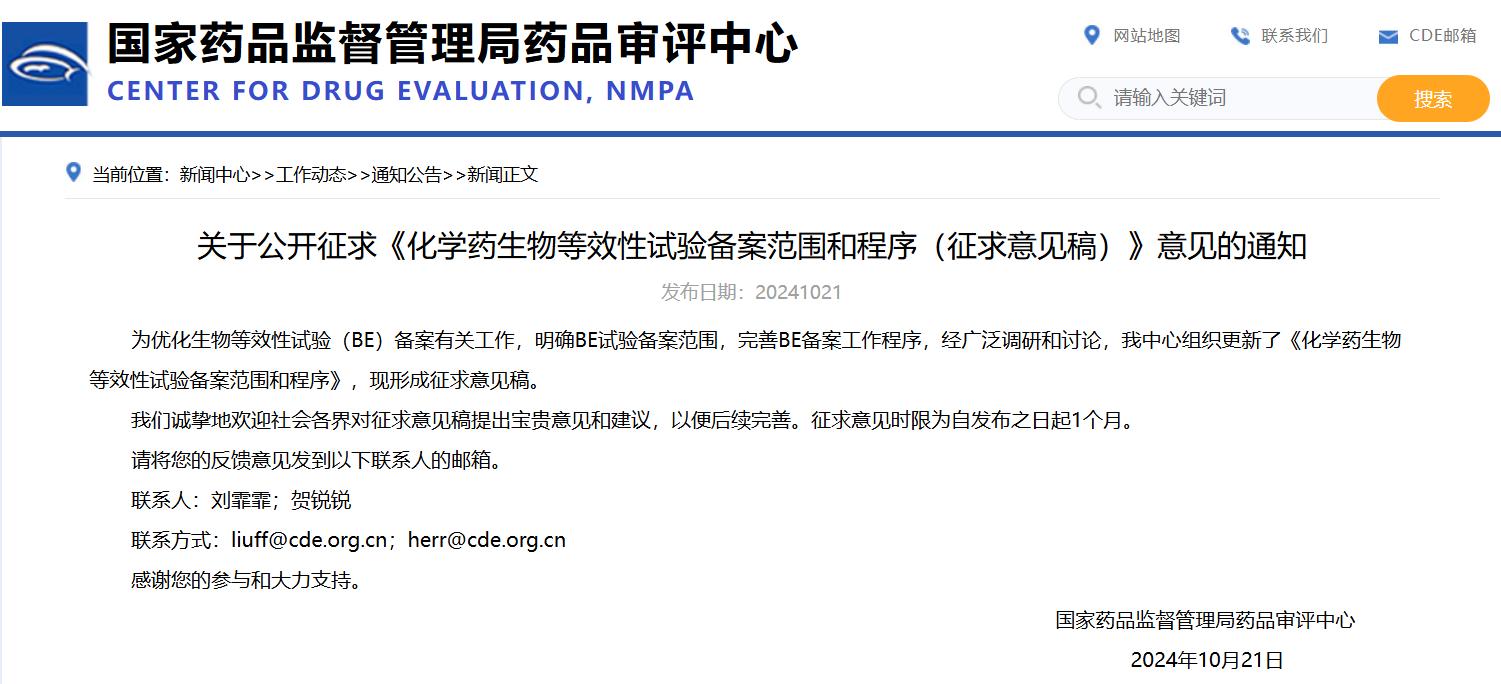 關(guān)于公開征求《化學(xué)藥生物等效性試驗備案范圍和程序(征求意見稿)》意見的通知
