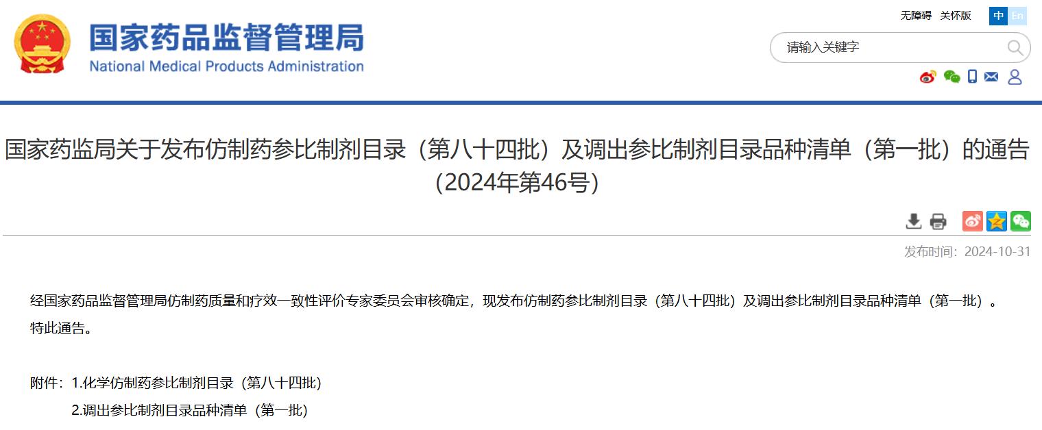 關(guān)于發(fā)布仿制藥參比制劑目錄(第八十四批)及調(diào)出參比制劑目錄品種清單(第一批)的通告(2024年第46號)