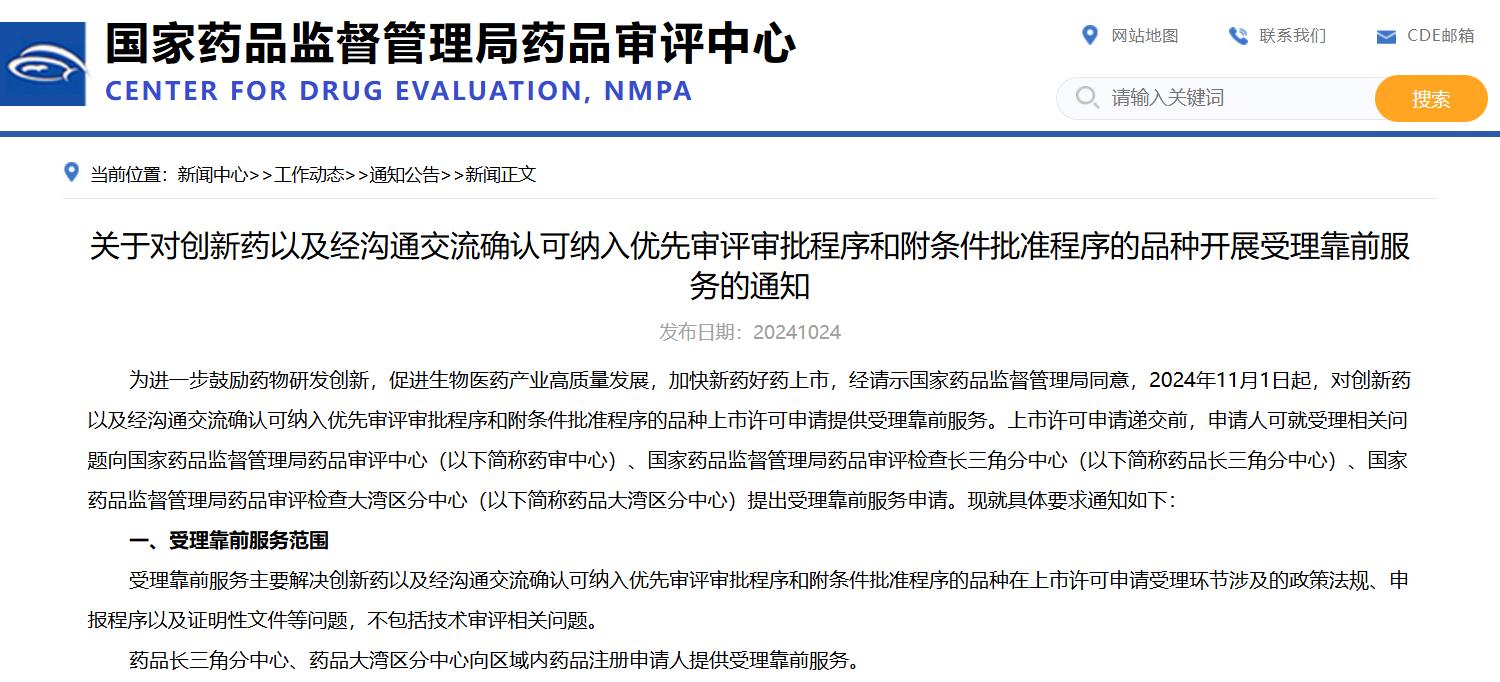 關(guān)于對創(chuàng)新藥以及經(jīng)溝通交流確認(rèn)可納入優(yōu)先審評審批程序和附條件批準(zhǔn)程序的品種開展受理靠前服務(wù)的通知