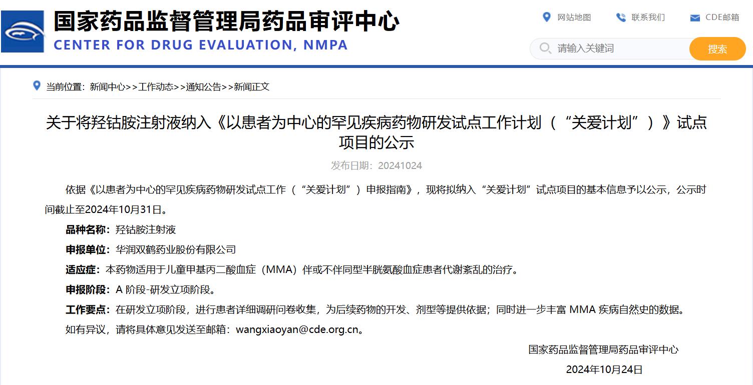 關(guān)于將羥鈷胺注射液納入《以患者為中心的罕見疾病藥物研發(fā)試點工作計劃(“關(guān)愛計劃”)》試點項目的公示
