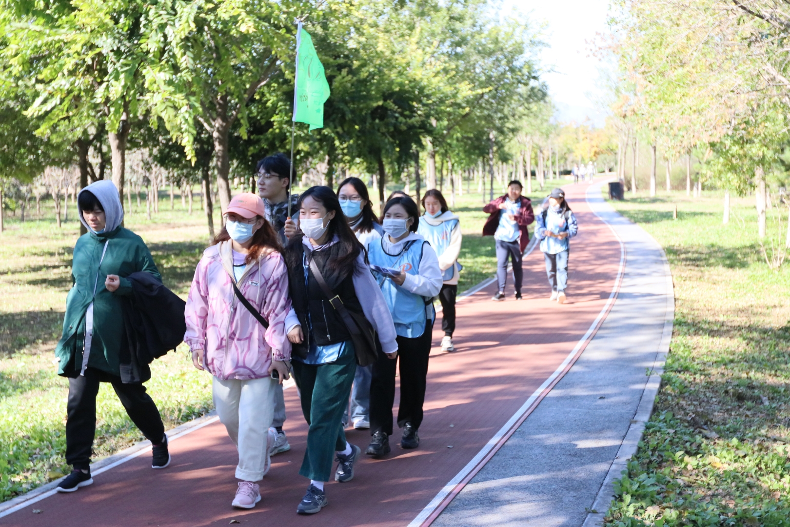 ▲ All team members hold high the team flag, listen to the autumn wind, step on fallen leaves, talk and laugh, and accompany their peers.